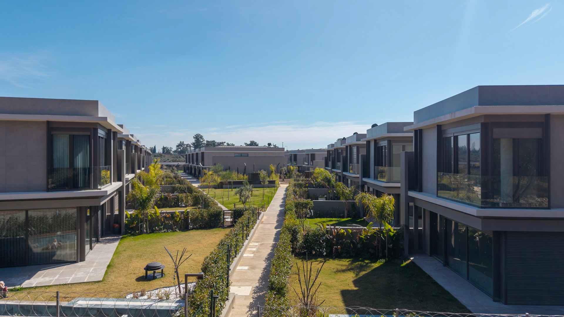 Her villanın özel yüzme havuzu, bahçe alanı, geniş teras ve hobi bahçesi bulunmaktadır. Teras alanları, barbekü ve açık hava yemekleri için ideal bir ortam sağlar. Bahçe peyzajı, projenin genel tasarım diline uygun şekilde profesyonel olarak düzenlenmektedir.