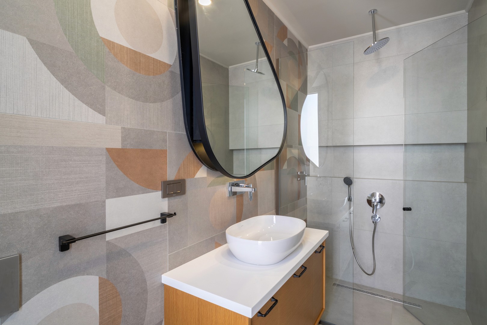 Ebeveyn süiti özel banyosu: duşakabin, küvet ve çift lavabo.